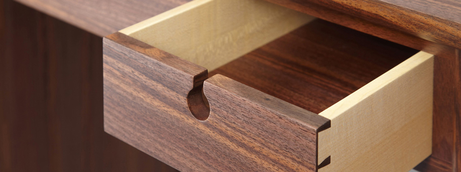 This piece is made from exquisite quality English walnut that Garry had been saving for years to make something special. The handles and base are in sycamore, to contrast, and the interior drawer parts are English oak and cedar. This represents the best possible workmanship and is available for sale on application.